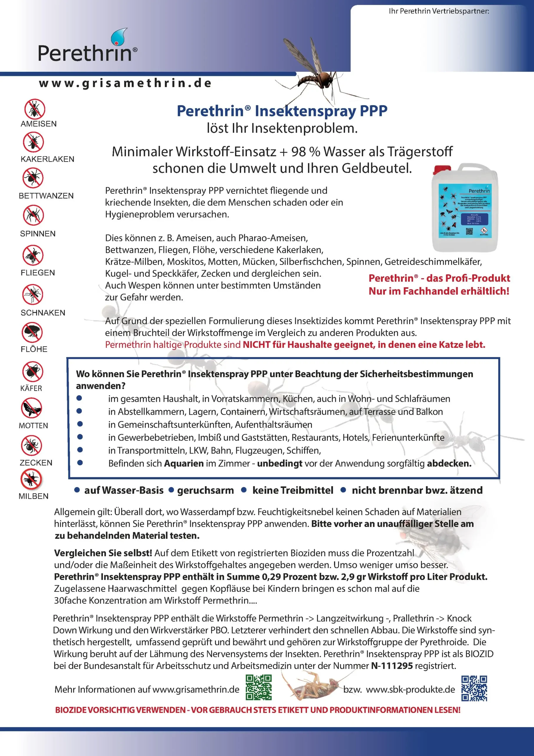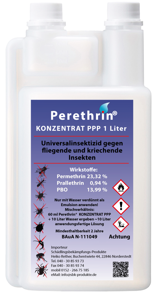 Wenn Google „Permethrin“ vorschlägt, sind Sie trotzdem richtig: Perethrin wird häufig als Permethrin gesucht oder verwechselt. Die Erklärung ist einfach: Perethrin® ist der Produktname für mein bewährtes Wirkstoffsystem und Permethrin der bekannte und bewährte Wirkstoff. Hinzu kommt in diesem hochwirksamen Insektizid der Knock-down Wirkstoff Prallethrin und der Wirkverstärker PBO.